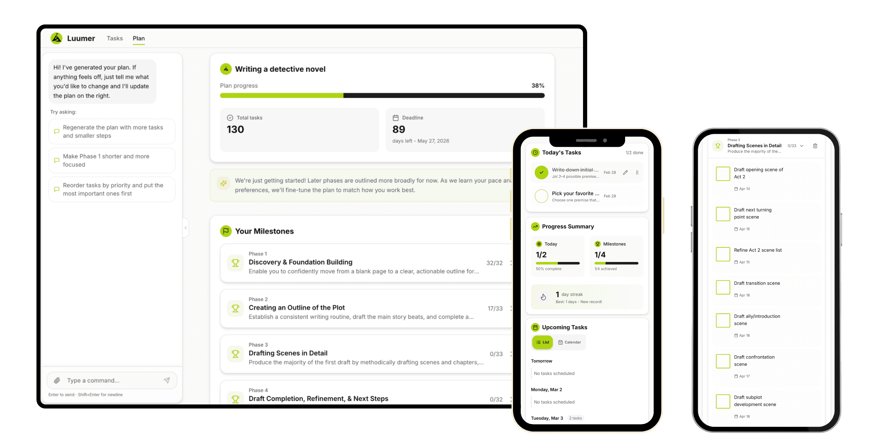 Luumer is a goal tracker app that breaks big goals into small, manageable tasks — calibrated to your time and delivered daily so you always know what to do next.